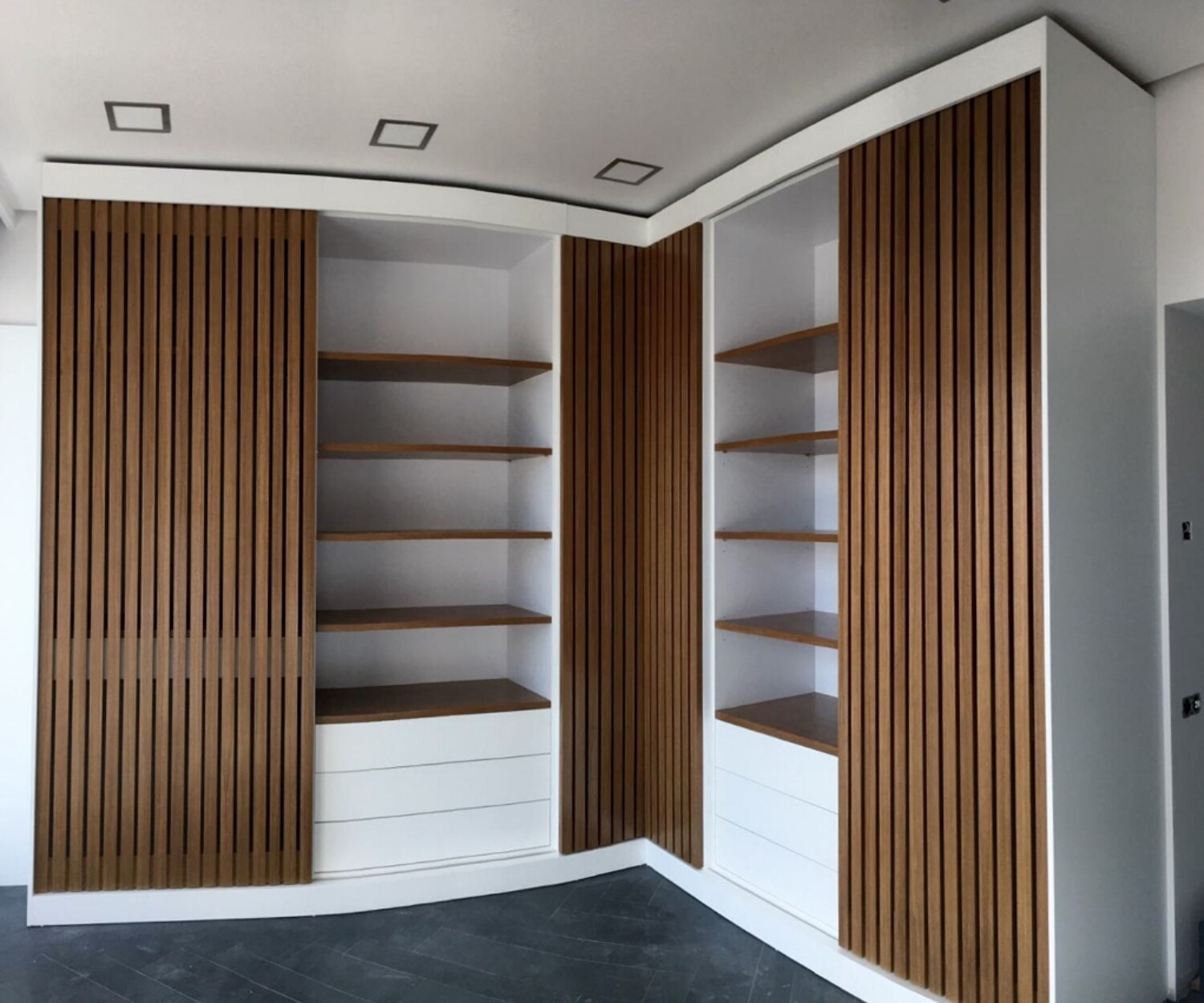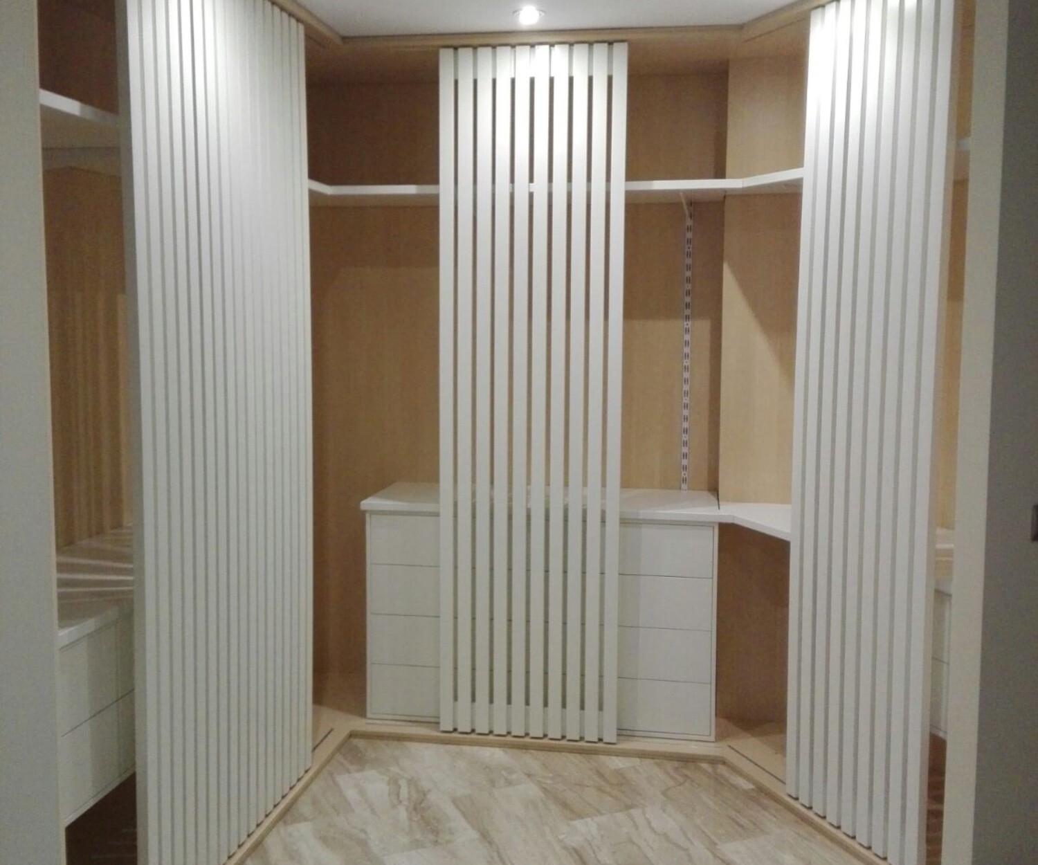 Vestidor lacado en blanco con puertas y baldas en roble